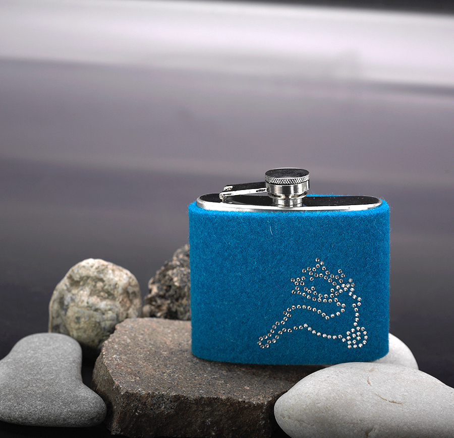 Flachmann mit Filzhülle Strass-Hirsch in mittelblau 150ml